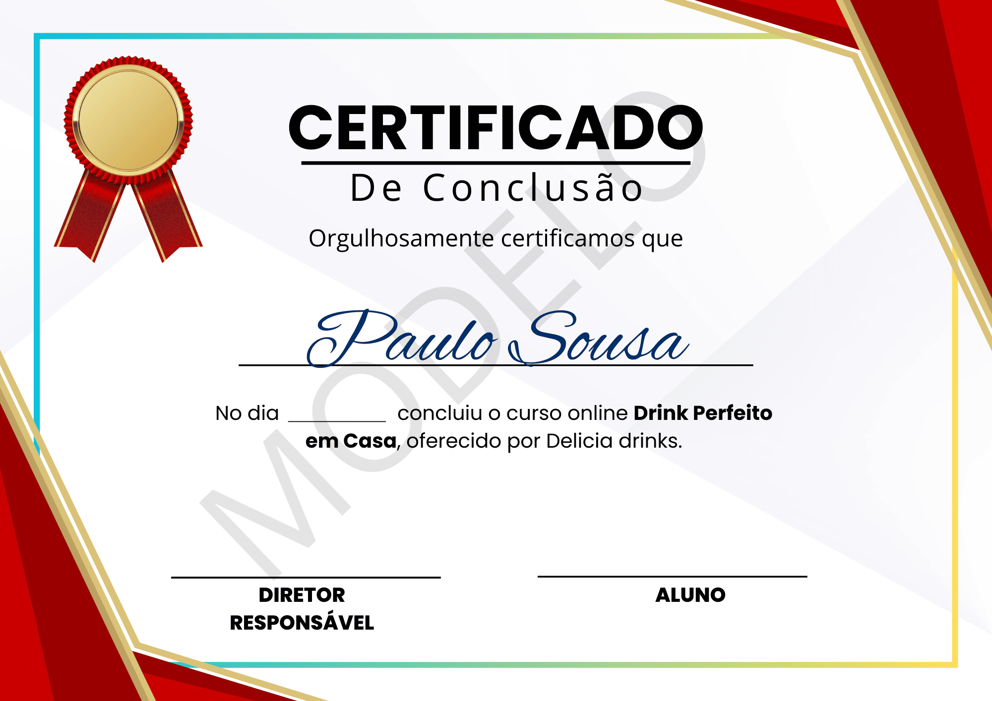 Ao finalizar o curso, você recebe um certificado de conclusão exclusivo, que comprova suas novas habilidades e é perfeito para valorizar seu currículo ou impulsionar sua carreira no mundo dos drinks!