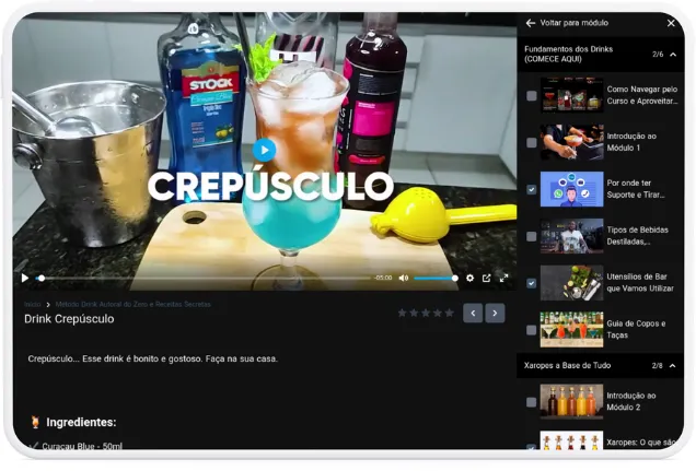 Neste módulo, você vai construir a base sólida para se tornar um mestre dos drinks, aprendendo desde os tipos de bebidas e destilados, até os utensílios essenciais que você vai usar para criar as receitas incríveis que vai aprender.